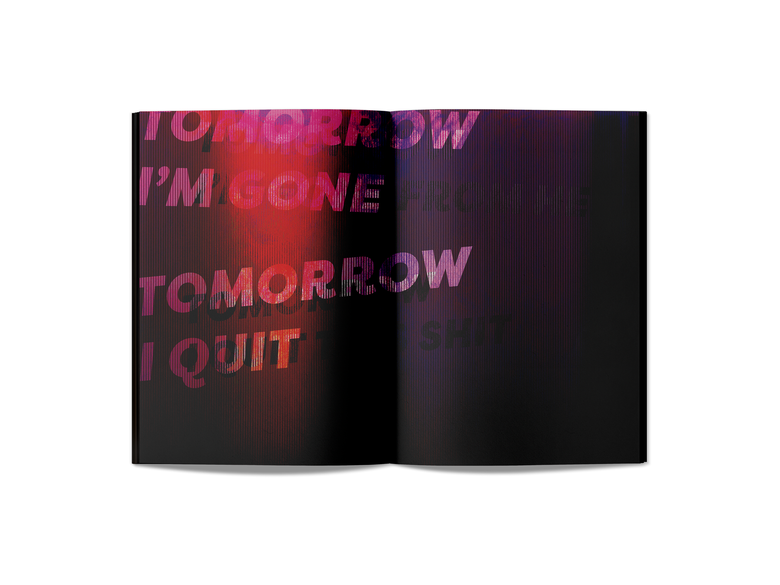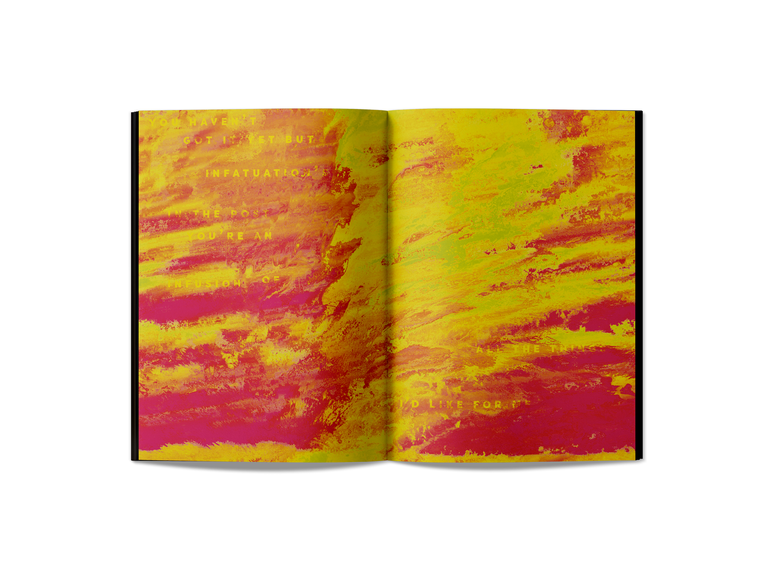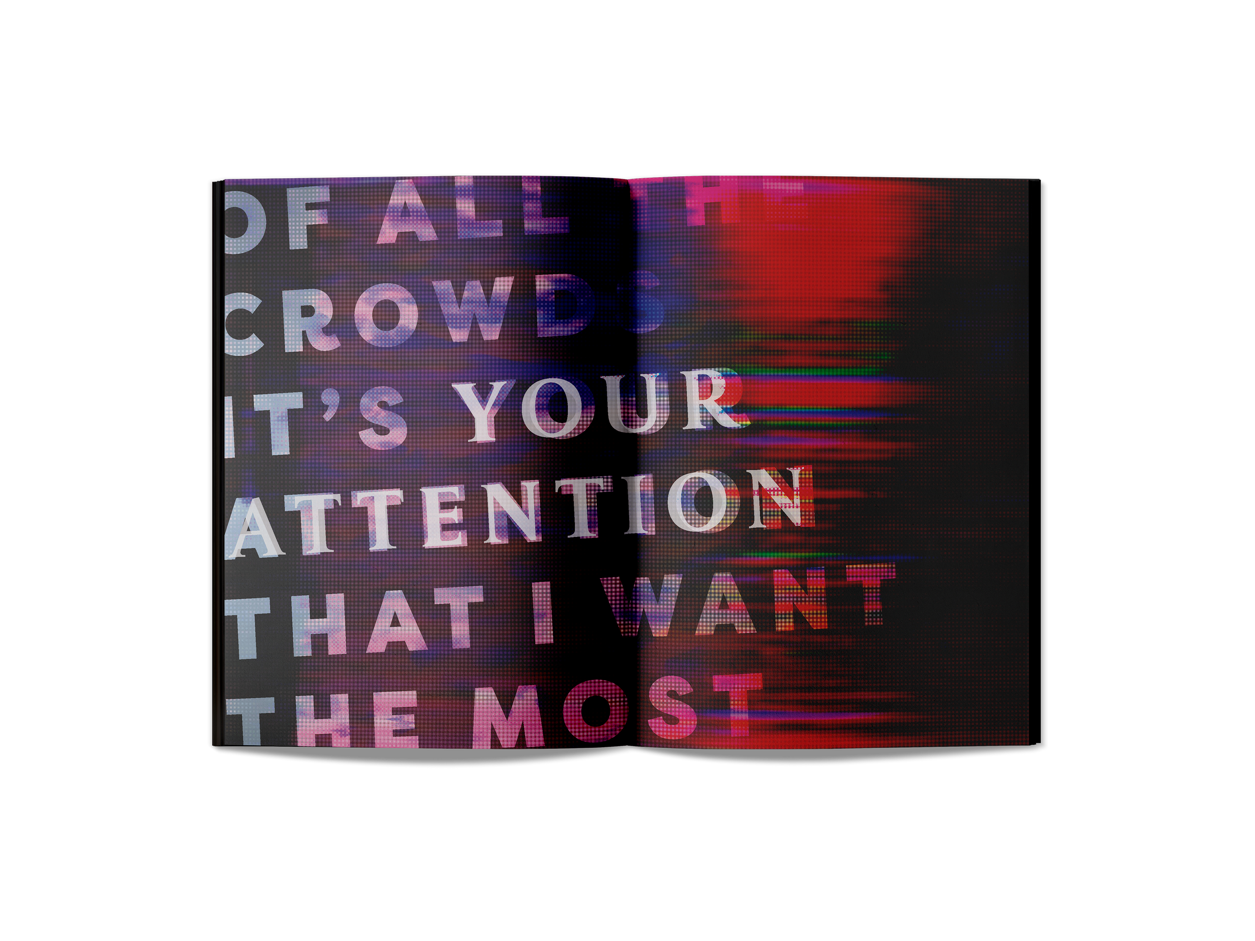 The idea? To experience the lyrics as the music is playing, with little consideration to the legibility of the lyrics or the pacing of the reader, as to pair with the song’s attitude and changes in tempo, the pages experimented instead with image manipulation and texture, often using photographs and textures from rehearsals and live shows but destroyed digitally to a point where they could no longer be made out.